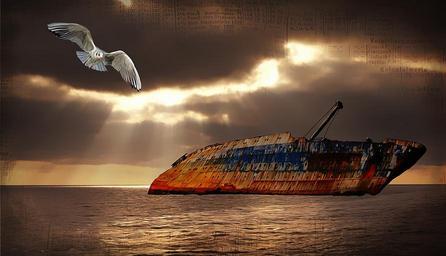 Keywords: sea lake water sky clouds sunset lighting ship merchant ship frack boat tails seagull bird painting digital art digital painting composing greeting card