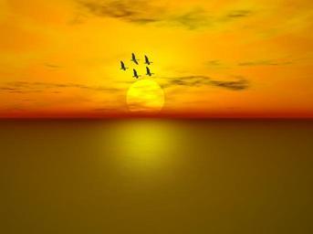Keywords: sea ocean geese flying sunset sky clouds water horizon beautiful reflection gold yellow