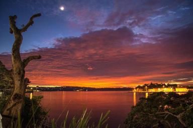 Keywords: sea ocean sunset harbour sydney sunrise sydney harbour moon clouds orange dead tree