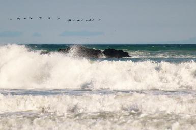 Keywords: sea ocean water wave spray foam rock flock of birds