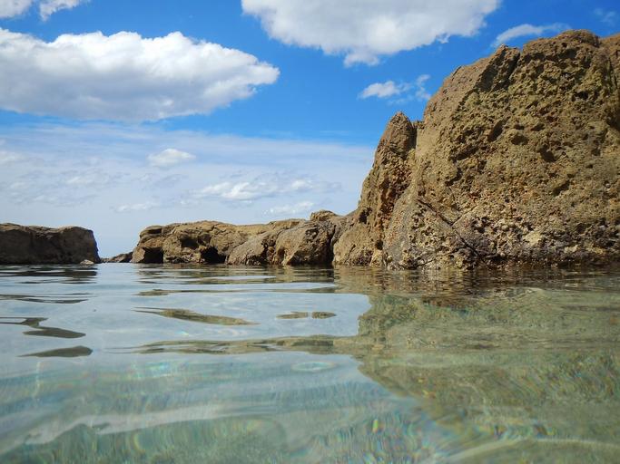Keywords: sea rocks clouds blue sky calm sea transparent water