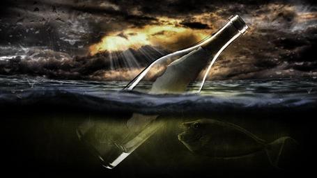 Keywords: sea water message in a bottle ocean wave light forward bottle clouds cloudiness fish mood underwater