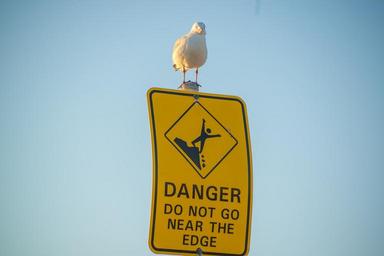 Keywords: seagull bird gull shore bird perched perching white aves avian fauna avifauna danger sign sign post warning australia