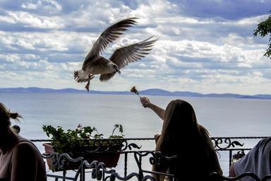 Keywords: seagull feeding the birds time restaurant outdoors holiday have lunch girl