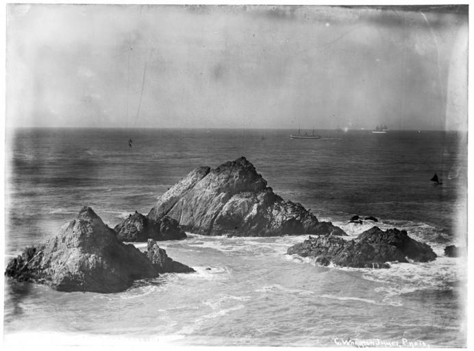 | Keywords: Seal rocks near San Francisco's Cliff House Restaurant, ca.1900 (CHS-4757).jpg en <br> Seal rocks near San Francisco's Cliff House Restaurant ca 1900 Photograph of San Francisco's Seal Rocks near Cliff House Restaurant not visible ca 1900 Several seals are sun bathing on the rocks Three large clumps of rock stick up out of the frothy surf A small sail boat is visible at right In the distance is a large steam ship and a sailing ship Call number CHS-4757 Legacy record ID chs-m9025; USC-1-1-1-9163 Photographer James George Wharton Filename CHS-4757 Coverage date circa 1900 Part of collection California Historical Society Collection 1860-1960 Type images Geographic subject city or populated place San Francisco Repository name USC Libraries Special Collections Accession number 4757 Microfiche number 1-48- Archival file chs_Volume67/CHS-4757 tiff Part of subcollection Title Insurance and Trust and C C Pierce Photography Collection 1860-1960 Repository address Doheny Memorial Library Los Angeles CA 90089-0189 Geographic subject country USA Format aacr2 1 photograph glass photonegative b w ; 17 x 22 cm Rights Digitally reproduced by the USC Digital Library; From the California Historical Society Collection at the University of Southern California Subject adlf natural rock formations Project USC Repository email specol usc edu Identifying number unidentified no James-1205 Contributing entity California Historical Society Date created circa 1900 Publisher of the digital version University of Southern California Libraries Format aat photographs Geographic subject state California Subject file heading San Francisco County -- Architecture -- Cliff houses and seal rocks Format glass plate negatives Access conditions Send requests to address or e-mail given Phone 213 821-2366; fax 213 740-2343 Geographic subject county San Francisco Subject lcsh Rocks; Seals Animals ; Restaurants lunch rooms etc Subject Cliff House circa 1900 date created James George Wharton http //digitallibrary usc edu/cdm/ref/collection/p15799coll65/id/8930 PD-old-70-1923 Images from USC Digital Library uploaded by Fæ California Historical Society Collection 1860-1960 Glass plate negatives Seal Rocks Photographs by George Wharton James |