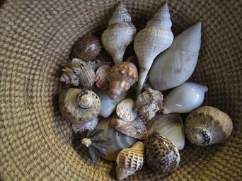 Keywords: seashells basket collection hard outer protective layers rough solid shapes structures marine life sharp bright natural formations