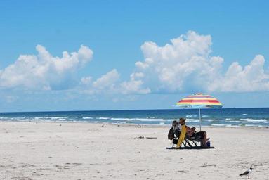 Keywords: seashore relaxation beach ocean chair umbrella sunshine clouds water sand sea surf sea gull bird coast seascape leisure vacation
