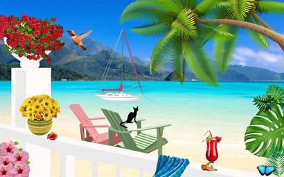Keywords: seaside summer chairs flowers sailboat black cat summer flowers balcony veranda relaxation tranquility ocean nature adirondack chairs bird hummingbird beach towel palm trees