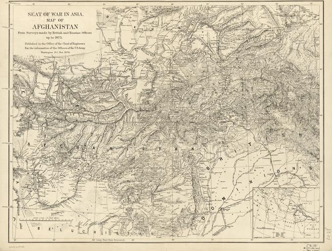 | Keywords: Seat of the War in Asia. Map of Afghanistan WDL12986.png Artwork ru Соединенные Штаты А мия Уп авление командующего Инжене ным ко пусом fr États-Unis Armée Office de l'ingénieur en chef du Corps du génie en United States Army Office of the Chief of Engineers zh 美国 陆军 工程师办公室 pt Estados Unidos Exército Gabinete do Chefe de Engenheiros ar الولايات المتحدة الأمريكية الجيش مكتب رئيس المهندسين es Estados Unidos Ejército Oficina del Jefe de Ingenieros ru Теат военных действий в Азии Ка та Афганистана fr Théâtre de la guerre en Asie Carte de l'Afghanistan en Seat of the War in Asia Map of Afghanistan zh 亚洲战争 :阿富汗 图 pt Local da guerra na Ásia Mapa do Afeganistão ar بؤرة الحرب في آسيا خريطة أَفْغَانِسْتَان ru Эта ка та была опубликована в нояб е 1878 года Уп авлением командующего Инжене ным ко пусом А мии США для сведения офице ов А мии США Заголовок ка ты Теат военных действий в Азии Ка та Афганистана связан со Вто ой англо-афганской войной 1878 1880 годов начавшейся в том месяце когда Великоб итания ст емясь ог аничить астущее как ей казалось влияние России в Афганистане вто глась в эту ст ану с те ито ии Б итанской Индии Ка та составлена по данным исследований выполненных б итанскими и оссийскими офице ами до 1875 года Особое внимание на ней уделено геог афическим объектам важным с точки з ения военных действий в том числе ключевым го одам го ам го ным пе евалам и их высоте а также до огам а ка те-в езке в п авом нижнем углу Афганистан показан как часть мак о егиона п отянувшегося от восточного побе ежья Аф ики до Индии и западного Китая с указанием асстояний от Лондона до ад аса сов еменный Ченнаи Индия Калькутты сов еменная Колката Сингапу а и д угих азиатских по тов <br>Афганские войны; Военные ка ты; Соединенные Штаты Аме ики А мия fr Cette carte fut publiée en novembre 1878 par l'office de l'ingénieur en chef du Corps du génie de l'armée américaine pour « l'information des officiers de l'armée des États-Unis » Son titre « Théâtre de la guerre en Asie Carte de l'Afghanistan » fait référence à la seconde guerre anglo-afghane de 1878 1880 qui commença le même mois lorsque la Grande-Bretagne envahit l'Afghanistan depuis l'Inde britannique afin de freiner l'influence croissante des Russes dans le pays La carte est basée sur des relevés d'officiers britanniques et russes réalisés « jusqu'en 1875 » Elle met en évidence les caractéristiques géographiques ayant un intérêt militaire telles que les principales villes les montagnes les cols de montagne et leur altitude et les routes Le cartouche en bas à droite place l'Afghanistan dans un contexte régional plus vaste de la côte est de l'Afrique à l'Inde et l'ouest de la Chine Il indique également les distances en milles de Londres à Madras actuelle ville de Chennai en Inde Calcutta aujourd'hui Kolkata Singapour et d'autres ports d'Asie <br>Guerres afghanes; Cartes militaires; États-Unis Armée en This map was published in November 1878 by the Office of the Chief of Engineers U S Army for the information of the Officers of the U S Army The title Seat of the War in Asia Map of Afghanistan refers to the Second Anglo-Afghan War of 1878 80 which began that month when Great Britain invaded Afghanistan from British India for the purpose of checking what it perceived as the growth of Russian influence in the country The map is based on surveys by British and Russian officers up to 1875 Geographic features with military implications such as key towns mountains mountain passes and their heights and roads are emphasized The inset map at the lower right places Afghanistan in the context of the wider region stretching from the east coast of Africa to India and western China and gives distances in miles from London to Madras present-day Chennai India Calcutta present-day Kolkata Singapore and other ports in Asia <br>Afghan Wars; Military maps; United States Army zh 这张 图由美国陆军部 工程师办公室于 1878 年 11 出版,旨 为美国陆军军官提供情报 标题 亚洲战争 :阿富汗 图 中的亚洲战争是指 1878-1880 年的第二次英国-阿富汗战争, 始于 1878 年 11 ,当时英国为了遏制俄罗斯 阿富汗势力的扩大 从英属印度入侵阿富汗 该 图是根据英国和俄罗斯军官 截至 1875 年 的勘测 绘制 图中重点标示了具 军事意义的 理特征,如重要城镇 山脉 山口及其高度 道路 右下方的插页 图将阿富汗置于范围更广的 理环境中,从 洲 海岸 直延伸到印度和中国西部,并列出了伦敦至马德拉斯(今印度金奈) 科尔卡塔(今加尔各答) 新加 和亚洲其他港口的英里 离 <br>阿富汗战争; 军事 图; 美国军队 pt Este mapa foi publicado em novembro de 1878 pelo Gabinete do Chefe de Engenheiros do Exército Americano para a informação dos oficiais do Exército dos EUA O título Local da guerra na Ásia mapa do Afeganistão faz referência à Segunda Guer