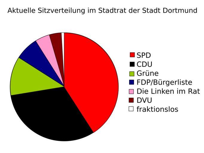 | Keywords: Seating of the town council in dortmund 2007 (de).svg en The seating of the town council in Dortmund Germany 2007 de Die Sitzverteilung im Stadtrat der Stadt Dortmund 2007 own GD2008 2008-08-29 History of Dortmund Election apportionment diagrams of North Rhine-Westphalia City councils Pie charts SVG pie charts Elections in 2007 |