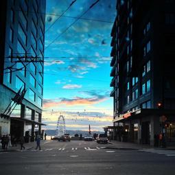 Keywords: seattle ferris wheel sunset architecture skyline tower building urban scenic scenery downtown metropolis buildings metropolitan