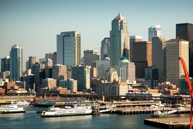 Keywords: seattle washington ships boats harbor bay water city cities skyline skyscrapers buildings architecture outside dock pier