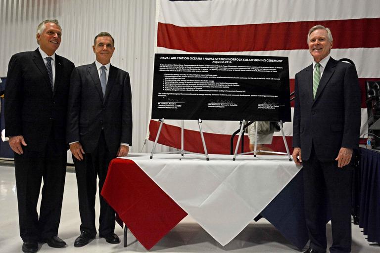 | Keywords: SECNAV poses for a photo after signing a ceremonial solar panel. (28709428136).jpg VIRGINIA BEACH Va Aug 2 2016 From left Governor of the Commonwealth of Virginia Terry McAuliffe President and CEO of Dominion Resources Inc parent company of Dominion Virginia Power Thomas F Farrell II and Secretary of the Navy Ray Mabus pose for a photo after signing a ceremonial solar panel commemorating the agreement to construct a 21-megawatt direct current solar energy facility at Naval Air Station NAS Oceana U S Navy photo by Mass Communication Specialist 2nd Class Alysia Hernandez/Released 160802-N-IS680-072 Join the conversation http //www navy mil/viewGallery asp www navy mil/viewGallery asp http //www facebook com/USNavy www facebook com/USNavy http //www twitter com/USNavy www twitter com/USNavy http //navylive dodlive mil navylive dodlive mil http //pinterest com pinterest com https //plus google com plus google com https //www flickr com/photos/usnavy/28709428136/ SECNAV poses for a photo after signing a ceremonial solar panel 2016-08-02 10 17 https //www flickr com/people/56594044 N06 Official U S Navy Page from United States of America MC2 SW Alysia Hernandez/U S Navy Attribution License IPTC Caption-Abstract U S Navy photo PD-USGov-Military-Navy Official U S Navy Imagery https //flickr com/photos/56594044 N06/28709428136 2016-08-03 18 51 46 cc-by-2 0 160802-N-IS680-072 Navy Files from the U S Navy Flickr stream People at Naval Air Station Oceana Ray Mabus in 2016 Taken with Nikon D7100 Terry McAuliffe |
