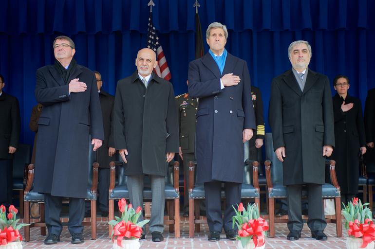 | Keywords: Secretaries Carter, Kerry Welcome Afghan President Ghani and CEO Abdullah to Pentagon Honor Cordon.jpg  en U S Defense Secretary Ash Carter and U S Secretary of State John Kerry stand between Afghan President Ashraf Ghani and Afghan CEO Abdullah Abdullah on March 23 2015 at the Pentagon in suburban Washington D C as the National Anthem is played during an Honor Cordon ceremony where Ghani thanked U S government leaders military members and citizens for their support and sacrifices on behalf of his country since 2001 State Department photo/ Public Domain 2015-03-23 07 57 06 http //www flickr com/photos/9364837 N06/16286338054/ U S Department of State other versions 38 871322 -77 055916 PD-USGov PD-USGov Relations of Afghanistan and the United States Uploaded with UploadWizard |