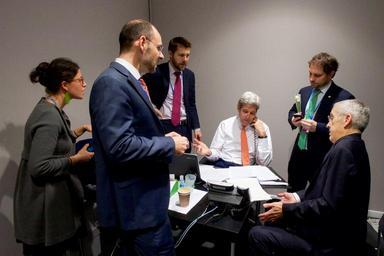 | Keywords: paris france cop21 climate change climatechange climate change talks climatechangetalks un united nations unitednations unfccc kerry john kerry johnkerry secretary of state john kerry secretaryofstatejohnkerry todd stern toddstern indoor U.S. Secretary of State John Kerry, flanked by White House Senior Adviser Brian Deese, State Department Chief of Staff Jon Finer, U.S. Special Envoy for Climate Change Todd Stern, and other advisers, speaks on December 12, 2015, with French Foreign Minister Laurent Fabius - President of the COP21 climate change conference - about the final draft of a multinational environmental agreement from the U.S. office space at LeBourget Airport in Paris, France. [State Department photo/ Public Domain] More State Department photos here: flic.kr/s/aHskqCniFb U.S. Secretary of State John Kerry, flanked by White House Senior Adviser Brian Deese, State Department Chief of Staff Jon Finer, U.S. Special Envoy for Climate Change Todd Stern, and other advisers, speaks on December 12, 2015, with French Foreign Minister Laurent Fabius - President of the COP21 climate change conference - about the final draft of a multinational environmental agreement from the U.S. office space at LeBourget Airport in Paris, France. [State Department photo/ Public Domain] More State Department photos here: flic.kr/s/aHskqCniFb |