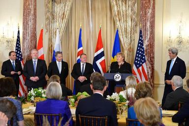 | Keywords: nordic summit 2016 nordicsummit2016 scandinavian leaders scandinavianleaders state department statedepartment U.S. Secretary of State John Kerry listens as Norwegian Prime Minster Erna Solberg delivers remarks at a working luncheon that the Secretary hosted in honor of Nordic leaders: Finnish President Sauli Niinistö, Swedish Prime Minister Stefan Löfven, Danish Prime Minister Lars Lokke Rasmussen, Icelandic Prime Minster Sigurdur Ingi Johannsson, and the Norwegian Prime Minister, at the U.S. Department of State in Washington, D.C., on May 13, 2016. [State Department photo/ Public Domain] U.S. Secretary of State John Kerry listens as Norwegian Prime Minster Erna Solberg delivers remarks at a working luncheon that the Secretary hosted in honor of Nordic leaders: Finnish President Sauli Niinistö, Swedish Prime Minister Stefan Löfven, Danish Prime Minister Lars Lokke Rasmussen, Icelandic Prime Minster Sigurdur Ingi Johannsson, and the Norwegian Prime Minister, at the U.S. Department of State in Washington, D.C., on May 13, 2016. [State Department photo/ Public Domain] |