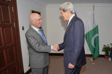 | Keywords: Secretary Kerry Meets Pakistani NSA Aziz.jpg en U S Secretary of State John Kerry greets Pakistani National Security Advisor Sartaj Aziz before a bilateral meeting in Bander Seri Begawan Brunei on July 2 2013 State Department photo 2013-07-02 00 16 40 http //www flickr com/photos/statephotos/9188500833/sizes/o/in/photostream/ U S Department of State U S Department of State http //flickr com/photos/9364837 N06/9188500833 2013-07-02 07 50 08 United States Government Work PD-USGov Uploaded with UploadWizard John Kerry in 2013 Sartaj Aziz Relations of Pakistan and the United States |