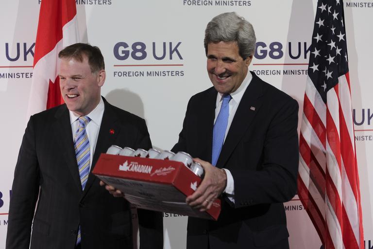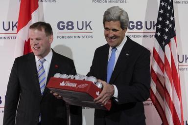 | Keywords: Secretary Kerry Receives a Case of Beer from Canadian Foreign Minister John Baird.jpg en U S Secretary of State John Kerry receives a case of beer from Canadian Foreign Minister John Baird fulfilling the terms of a bet made over a US-Canada women's hockey match during a break in the G8 ministerial meetings in London United Kingdom April 11 2013 State Department photo/ Public Domain 2013-04-11 10 30 47 http //www flickr com/photos/statephotos/8639238213/sizes/o/in/photostream/ U S Department of State U S Department of State http //flickr com/photos/9364837 N06/8639238213 2013-04-11 14 50 20 United States Government Work PD-USGov Uploaded with UploadWizard John Kerry in 2013 John Baird Canadian politician 39th G8 summit Beer cans Molson Breweries Relations of Canada and the United States |