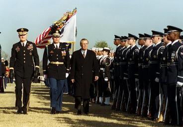 | Keywords: Secretary Rumsfeld inspects honor guard 20010126.jpg en Secretary of Defense Donald H Rumsfeld right is escorted by Commander of Troops Col Thomas M Jordan center U S Army and Chairman of the Joint Chiefs of Staff Gen Henry H Shelton U S Army as he inspects the troops at an Armed Forces Full Honor Welcoming Ceremony and Review in his honor at the Pentagon parade field on Jan 26 2001 Rumsfeld was sworn in as the 21st secretary of Defense in a ceremony at the White House Oval Office earlier today http //www defense gov/photos/newsphoto aspx newsphotoid 3198; http //www defense gov/dodcmsshare/newsphoto/2001-02/010126-D-9880W-221 jpg DoD photo by R D Ward Released 2001-01-26 2001 photographs 2001 in Virginia January 2001 in the United States Military people in 2001 Donald Rumsfeld in 2001 Henry H Shelton Inspections of troops PD-USGov January 2001 photographs |