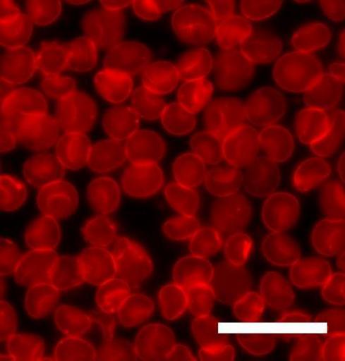 Keywords: Sedimented red blood cells.jpg en Human red blood cells erythrocytes supported on a glass slide The cell membrane is stained with the lipid bilayer dye octadecyl rhodamine Scale bar is 20 microns Own MDougM 2009-02-11 Microscopic images Red blood cells |
