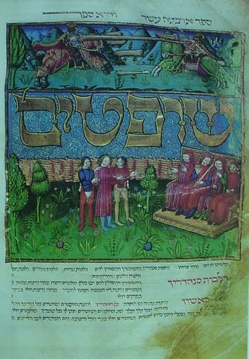 | Keywords: Sefer Mishpatim title-panel.jpg en Facsimile of a page with a decorated title-panel of Sefer Mishpatim Book of Civil Law from the 13th book of the Mishneh Torah northern Italy 15th century In the bottom register three men stand before a panel of four seated judges The top register consists of a jousting scene that is unrelated to the text Private collection fol 298v Ex No 69 century 15 http //www library yale edu/judaica/site/exhibits/maimonides/exhibit1 html Yale author File Mishneh Torah Books 7 to 14 by Maimonides - Google Art Project jpg PD-Art 14th-century illuminated manuscripts Illuminated manuscripts in Hebrew Uploaded with UploadWizard Mishneh Torah Beth din |