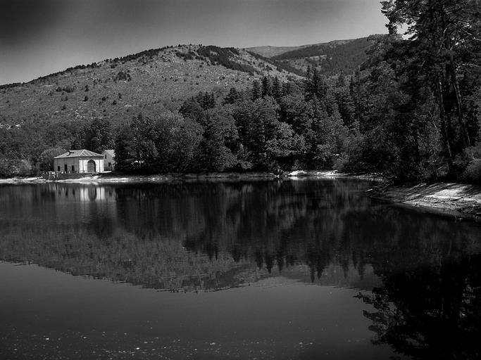 Keywords: segovia spain mountains forest trees woods lake water reflections building shore shoreline black and white nature outside country countryside