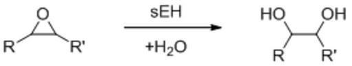 Keywords: SEH reaction.png General reaction scheme of the soluble epoxide hydrolase sEH enzyme own Pepe king prawn 2009-06-20 Enzyme reactions Addition reactions Epoxide hydrolase Reactions of epoxides