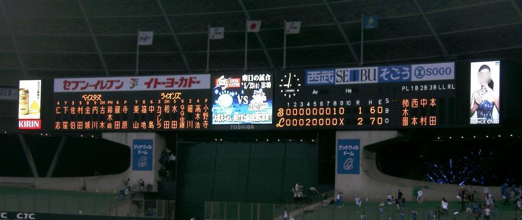 | Keywords: Seibu Dome baseball stadium - 31.jpg Seibu Dome Seibu Lions professional baseball team located in Tokorozawa Saitama Japan 西武ドーム 日 の埼玉 沢市にあるドーム式野球場 日 のプロ野球パリーグに加盟する 西武ライオンズのホーム球場でもある 電光スコア ードを撮影 Tokoroten 's file 2007/5/22 Tokoro_ten セパ交流戦第1試合・試合結 May 22 2007 match start 18 03 goodwill Dome 2007年5 22日 試合開始18時03分グッドウィルドーム 西武ライオンズ対横 ベイスターズ・セパ交流戦第1試合で西武2 横 1で西武の 利 wikitable - align center bgcolor cccccc 1 2 3 4 5 6 7 8 9 計 - align center left Yokofama 0 0 0 0 0 0 0 1 0 1 - align center left Seibu 0 0 0 2 0 0 0 0 0 2 利投手 西武 涌井(7 2敗0S) 敗戦投手 横 寺原(4 3敗0S) セーブ 西武 小野寺(0 1敗9S) 塁打 横 田 9号 8回ソロ バッテリー横 寺原 - 相 / 西武 涌井 小野寺 - 細 Seibu Dome |