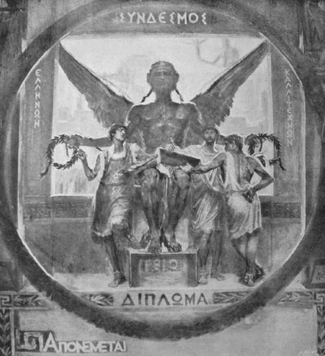 | Keywords: SEK 1910 diploma.jpg en Petros Roumbos The Sundesmos Ellinon Kallitexnon League of Greek Artists diploma sketch en Πέτρος Ρούμ ος ακέτα για το Δί λωμα του Συνδέσμου Ελλήνων Καλλιτεχνών σχέδιο εριοδικό Τα Παναθήναια 31 αΐου 1911 1911-05-31 Kallitexnhs The Artist Greek Magazine 1910 Georgios Roilos Petros Roumpos unknown other versions PD-old-70-1923 Uploaded with UploadWizard Painting | ||||