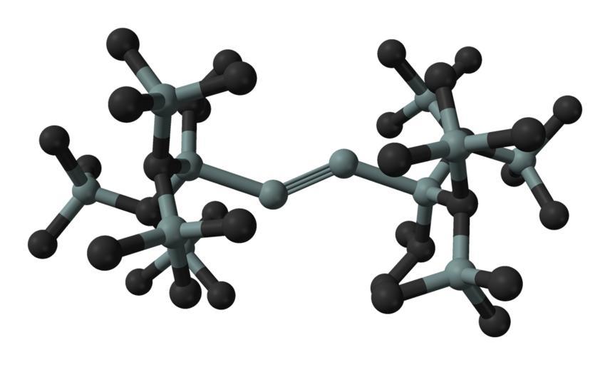 | Keywords: Sekiguchi-silyne-from-xtal-3D-balls.png Ball-and-stick model of a disilyne a molecule containing a silicon-silicon triple bond Carbon atoms are black silicon grey hydrogen atoms omitted for clarity X-ray crystallographic data from cite journal A Stable Compound Containing a Silicon-Silicon Triple Bond Akira Sekiguchi Rei Kinjo Masaaki Ichinohe Science September 2004 305 5691 1755 “ 1757 10 1126/science 1102209 Own 2008-11-21 Ben Mills Benjah-bmm27 Images by Ben Mills Organosilicon compounds |