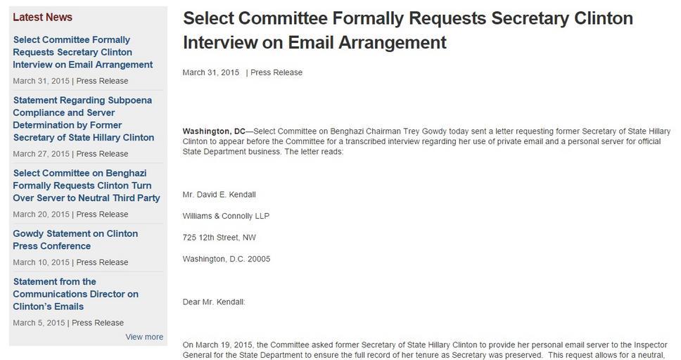 | Keywords: Select Committee Formally Requests Secretary Clinton Interview on Email Arrangement.jpg Select Committee Formally Requests Secretary Clinton Interview on Email Arrangement March 31 2015 Press Release Washington DC ”Select Committee on Benghazi Chairman Trey Gowdy today sent a letter requesting former Secretary of State Hillary Clinton to appear before the Committee for a transcribed interview regarding her use of private email and a personal server for official State Department business The letter reads Mr David E Kendall<br /> Williams Connolly LLP<br /> 725 12th Street NW<br /> Washington D C 20005 Dear Mr Kendall On March 19 2015 the Committee asked former Secretary of State Hillary Clinton to provide her personal email server to the Inspector General for the State Department to ensure the full record of her tenure as Secretary was preserved This request allows for a neutral detached and independent third-party review of the server to identify information responsive to this Committee ™s subpoena The Committee suggested the current Inspector General for the Department of State ”nominated by President Obama and confirmed without a dissenting vote by the U S Senate ”to conduct this review independently The Committee was then and remains open to the designation of another neutral detached and independent arbiter to review Secretary Clinton ™s server to ensure all relevant records have been preserved and produced to the Committee consistent with its subpoena Secretary Clinton ™s refusal to allow the Inspector General to ensure the public record is complete is not only disappointing but portends to delay the ability of our Committee to complete its work as expeditiously as possible We therefore urge the Secretary to reconsider her position and allow a neutral detached and independent arbiter ensure the public record is complete and all materials relevant to the Committee ™s work have been provided to the Committee If the Secretary continues to reject the offer of a neutral review the House of Representatives as a whole will need to consider its next steps As you know the production of documents made to the Select Committee represents a very small portion of the total public record housed in the Secretary ™s possession until recently As such other committees of Congress as well as the media and the public at large have equities in the Secretary ™s public record Although I have made this abundantly clear it bears repeating our Committee has no interest in any emails related to the Secretary ™s personal private matters nor is our Committee seeking documents unrelated to Libya and Benghazi during the relevant time periods The Committee is however committed to reviewing and considering every document related to the work the House of Representatives charged us with doing Toward that end and because of the Secretary ™s unique arrangement with herself as it relates to public records during and after her tenure as Secretary of State this Committee is left with no alternative but to request Secretary Clinton appear before this Committee for a transcribed interview to better understand decisions the Secretary made relevant to the creation maintenance retention and ultimately deletion of public records The Committee is willing to schedule the interview at a time convenient for Secretary Clinton but no later than May 1 2015 The Committee believes a transcribed interview would best protect Secretary Clinton ™s privacy the security of the information queried and the public ™s interest in ensuring this Committee has all information needed to accomplish the task set before it Once there is a reasonable assurance all documents in the Secretary ™s care custody and control related to what happened before during and after the attacks in Benghazi have been shared with the Committee we will be in a position to schedule her appearance in a public hearing to constructively discuss these topics We share the Secretary ™s desire these two conversations take place as quickly and efficiently as possible and are willing to expedite both working with your office the Secretary ™s schedule and our Democrat colleagues on the Committee What the Committee cannot do is conclude its work without assurances the Committee has all relevant information necessary for us to discharge the duties required of us We continue to believe Secretary Clinton ™s email arrangement with herself is highly unusual if not unprecedented The decision to delete these records during the pendency of a congressional investigation only exacerbates our need to better understand what the Secretary did when she did it and why she did it While she has cited a variety of justifications for this arrangement many questions and details about the arrangement remain unanswered These questions relate to 1 her decision to bypass an official government email account; 2 whether she affirmatively turned over any relevant records during the pendency of the Accountability Review Board investigation or at any time after Congress first began investigating the Benghazi attack until December 2014; 3 her decision to retain those records upon separation from the Department of State; 4 the methodology by which these emails were subsequently searched for evidence of official records; and 5 her decision to delete certain emails The Committee also reiterates pending the resolution of this matter the server and any associated information data backups and equipment must be preserved wherever they reside and that any further deletion or destruction of data or information must cease As you should be well aware it is technically possible in many instances to recover electronic information notwithstanding whether it has been deleted or overwritten It is precisely for this reason a neutral and objective party must have access to the server and related equipment to identify information potentially responsive to relevant laws and investigative re