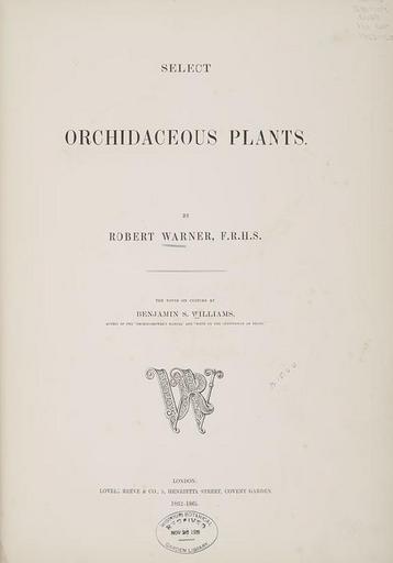 | Keywords: Select Orchidaceous Plants - First series - title page.jpg Title page of Select orchidaceous plants first series <br> http //www botanicus org/page/269392 1862-1865 Walter Hood Fitch 1817 - 1892 illustrator <br> Robert Warner 1814-1896 and Benjamin Samuel Williams 1822-1890 editors <br> PD-Art Robert Warner - Select Orchidaceous Plants |