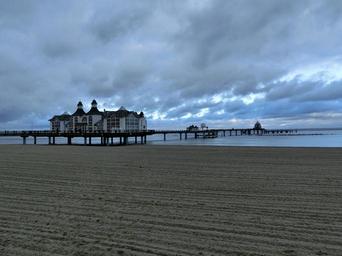 Keywords: sellin beach baltic sea sea bridge rügen island evening blue clouds