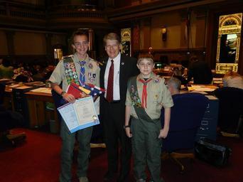 Keywords: indoor Assistant Minority Leader Mark Scheffel presents flags to Boy Scouts from his district. Assistant Minority Leader Mark Scheffel presents flags to Boy Scouts from his district.