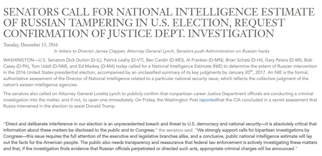 | Keywords: Senators Call for National Intelligence Estimate of Russian Tampering in US Election, Request Confirmation of Justice Dept Investigation.png en SENATORS CALL FOR NATIONAL INTELLIGENCE ESTIMATE OF RUSSIAN TAMPERING IN U S ELECTION REQUEST CONFIRMATION OF JUSTICE DEPT INVESTIGATION Tuesday December 13 2016 In letters to Director James Clapper Attorney General Lynch Senators push Administration on Russian hacks WASHINGTON U S Senators Dick Durbin D-IL Patrick Leahy D-VT Ben Cardin D-MD Al Franken D-MN Brian Schatz D-HI Gary Peters D-MI Bob Casey D-PA Tom Udall D-NM and Ed Markey D-MA today called for a National Intelligence Estimate NIE to determine the extent of Russian intervention in the 2016 United States presidential election accompanied by an unclassified summary of its key judgments by January 20th 2017 An NIE is the formal authoritative assessment of the Director of National Intelligence related to a particular national security issue which reflects the collective judgment of the nation s sixteen intelligence agencies The senators also called on Attorney General Loretta Lynch to publicly confirm that nonpartisan career Justice Department officials are conducting a criminal investigation into the matter and if not to open one immediately On Friday the Washington Post reportedthat the CIA concluded in a secret assessment that Russia intervened in the election to assist Donald Trump Direct and deliberate interference in our election is an unprecedented breach and threat to U S democracy and national security it is absolutely critical that information about these matters be disclosed to the public and to Congress the senators said We strongly support calls for bipartisan investigations by Congress this issue requires the full attention of the executive and legislative branches alike and a conclusive public national intelligence estimate will lay out the facts for the American people The public also needs transparency and reassurance that federal law enforcement is actively investigating these matters and that if the investigation finds evidence that Russian officials perpetrated or directed such acts appropriate criminal charges will be announced Full text of the senators letter to Director of National Intelligence James Clapper December 13 2016 The Honorable James Clapper Director of National Intelligence Washington D C 20511 Dear Director Clapper We request an immediate National Intelligence Estimate NIE regarding Russian efforts to manipulate the recent U S presidential election including public release of its key judgments no later than January 20 2017 Recently disclosed U S intelligence findings as publicly reported that Russia interfered in the U S presidential election and sought to undermine our democratic institutions and the consequences thereof including possible future such attacks on the United States are deeply concerning They make it imperative that information be provided to the public and Congress Quite simply deliberate interference in our election to favor a particular candidate is an unprecedented breach and threat to U S democracy and national security On Saturday December 10 2016 the Washington Post reported that the CIA concluded in a secret assessment that Russia intervened in the 2016 presidential election to help a particular candidate win the election It further reported that U S intelligence agencies have identified individuals with connections to the Russian government who provided WikiLeaks with thousands of hacked emails from the Democratic National Committee and others including Hillary Clinton s campaign chair Russia was also reported to have had a role in cyber intrusions in at least two U S state election systems These were described as individuals or actors known to the intelligence community and part of a wider Russian operation to boost one candidate over the other The Post quoted a senior U S official briefed at an intelligence presentation made to some U S senators as saying It is the assessment of the intelligence community that Russia s goal here was to favor one candidate over the other to help Trump get elected Also reported was that intelligence agency briefers told some senators as recently as last week that it was now quite clear that electing Trump was Russia s goal In fact you were quoted in early October as saying We believe based on the scope and sensitivity of these efforts that only Russia s senior-most officials could have authorized these activities Under President Putin Russia has taken aggressive actions that are contrary to American interests and those of its key allies Its military has seized land in Georgia and Ukraine and aggressively tried to sow disinformation and instability in European democracies It plants false news promotes a distorted and false narrative about threats to Russia and ethnic Russians in border states funds political parties sympathetic to Russian interests and reportedly conducts cyberattacks against key Western interests Its proxies were recently implicated in a coup plot in Montenegro and were involved in murdering more than 300 innocent civilians in a downed commercial airline over occupied eastern Ukraine Russian military forces have aggressively probed NATO-member airspace and waters and conducted reckless intercepts of U S aircraft in international airspace It has reportedly tried to manipulate upcoming German elections Finally Russian State TV host and Putin confidant Dmitry Kiselyov also known as the Kremlin s Chief Propagandist warned this year that impudent U S behavior towards Russia may have nuclear consequences Quite simply Russia is determined to foster political chaos and institutional mistrust in the West and may have alarmingly succeeded in the United States Given the serious nature of these matters with unprecedented national security implications we believe that our intelligence community must prioritize a conclusive public NIE to lay out the facts of this serious matter for
