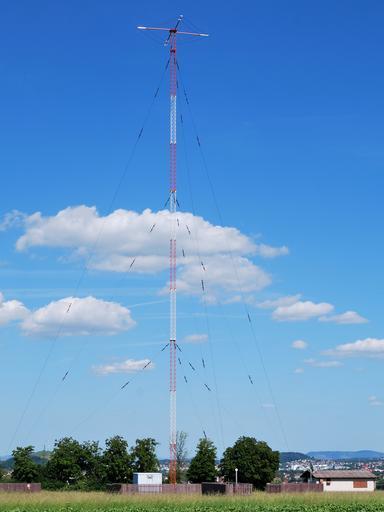 | Keywords: Sendemast Hirschlanden.jpg Mast radiator broadcasting antenna with a capacity hat at the top for electrical lengthening Radio mast of the medium wave transmitter in Hirschlanden Baden-Württemberg Germany of the Deutsche Telekom AG for the AFN The screen of wires supported by the four radial arms at the top of the antenna acted as a capacitor plate with the ground as the other plate Each cycle of the alternating current radio signal current flows in and out of the hat just as if the tower continued above it This serves to increase the current in the top part of the antenna increasing the radiated power as if the tower was longer Selbststrahlender Sendemast mit Dachkapazität Sendemast des Mittelwellensenders Hirschlanden Baden-Württemberg der Deutschen Telekom AG für den AFN own Harke 2009-06-03 thumb left 0 6 48 49 43 95 N 9 2 6 19 E zoom 15 QualityImage Sender Hirschlanden Taken with Nikon D60 Quality Images by User Harke Quality images of Landkreis Ludwigsburg Antenna masts with capacitive top hats |