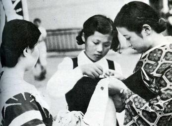 Keywords: Senninbari.jpg Senningbari 千人 Women stitching Senninbari for men going to the front in China Second Sino-Japanese War Mainichi Newspaper Company 毎日新聞社 1937 author PD-Japan-oldphoto Imperial Japanese Army