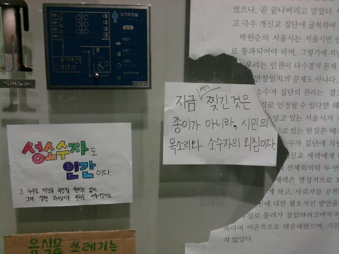 Keywords: Seoul LGBT sit-in protest 2014-03.jpg en LGBT protestors and their supporters are occupying and sitting in Seoul City Hall building 1st floor They are blaming mayor Park Won-soon for disusing city charter of rights including sex orientation and gender identity and demanding to reutilize charter Mayor Park had visited conservative protestant pastors' organization and speaked his mind that he should protect rights of transsexuals but do not support homosexuality own Sally Relpek me 2014-12-08 ImageNote 1 21 469 491 307 1280 960 2 Sexual minorities are human too Nobody can dare denying that truth even mayor more even the God ImageNoteEnd 1 ImageNote 2 608 307 453 317 1280 960 2 What teared down here is not a paper but a voice of citizen and scream of minorities ImageNoteEnd 2 LGBT Seoul City Hall Occupation and Sit-in 2014 |
