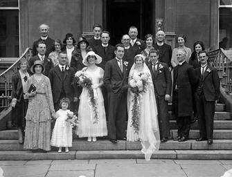 | Keywords: sergeant liam hayes sergeantliamhayes liam hayes liamhayes boreenmanna cork ireland september 1931 1930s matrimonio vintage poole collection poolecollection glass negative glassnegative a.h. poole ahpoole arthur henri poole arthurhenripoole weddings national library of ireland nationallibraryofireland waterford location identified locationidentified blackandwhite people monochrome wedding black and white Wedding of (police) Sergeant Liam Hayes of Boreenmanna, Cork. Per Niall McAuley while the groom may have been from Cork, the image was taken outside the Imperial Hotel in Waterford. guliolopez later used this information to find a version of this image in the Cork Examiner from 22 September 1921. Titled "Cork-Kilkenny Wedding at Waterford", the Examiner image effectively lists all those pictured and gives us much more detail on the image. Thanks guys!  Group taken on the steps of the Imperial Hotel, Waterford after the marriage of Sergeant Liam Hayes, Civic Guards, a native of Cork, and at present stationed at Cuffesgrange, Co. Kilkenny, to Miss Mai Ahern, Coone, Castlecomer, Co. Kilkenny. Mr. Frank Hayes, brother of the bride-groom, was best man, and the bridesmaids were Miss Lily Hayes, Cork and Miss Betty Fox, Curragh. The ceremony was performed at Ferrybank Waterford by Rev. J. Ahern, C.C. brother of the bride, assisted by Rev. Fr Hughes P.P, Cuffesgrange; Rev Fr. Bergin P.O Kilmanagh; Rev. Fr. Dowling, C.C. Kilmoganny; Rev Fr. Power C.C, Coone, and Rev. Fr. Purcell Birmingham (Poole, Waterford) - Cork Examiner, 22 September 1921 Date: 17 September 1931 NLI Ref.: P_WP_3870 Wedding of (police) Sergeant Liam Hayes of Boreenmanna, Cork. Per Niall McAuley while the groom may have been from Cork, the image was taken outside the Imperial Hotel in Waterford. guliolopez later used this information to find a version of this image in the Cork Examiner from 22 September 1921. Titled "Cork-Kilkenny Wedding at Waterford", the Examiner image effectively lists all those pictured and gives us much more detail on the image. Thanks guys! Group taken on the steps of the Imperial Hotel, Waterford after the marriage of Sergeant Liam Hayes, Civic Guards, a native of Cork, and at present stationed at Cuffesgrange, Co. Kilkenny, to Miss Mai Ahern, Coone, Castlecomer, Co. Kilkenny. Mr. Frank Hayes, brother of the bride-groom, was best man, and the bridesmaids were Miss Lily Hayes, Cork and Miss Betty Fox, Curragh. The ceremony was performed at Ferrybank Waterford by Rev. J. Ahern, C.C. brother of the bride, assisted by Rev. Fr Hughes P.P, Cuffesgrange; Rev Fr. Bergin P.O Kilmanagh; Rev. Fr. Dowling, C.C. Kilmoganny; Rev Fr. Power C.C, Coone, and Rev. Fr. Purcell Birmingham (Poole, Waterford) - Cork Examiner, 22 September 1921 Date: 17 September 1931 NLI Ref.: P_WP_3870 |