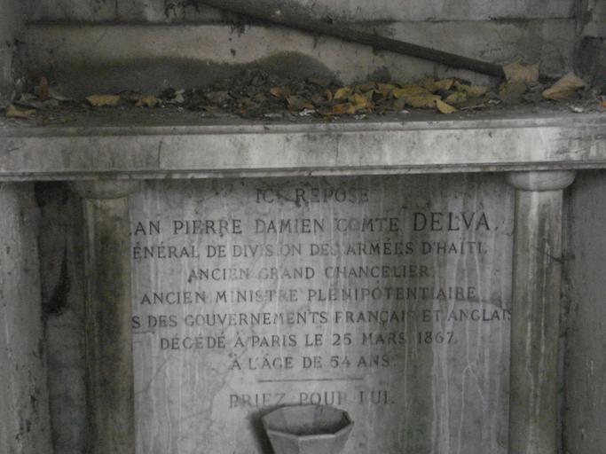 | Keywords: Sépulture du général comte Jean-Pierre-Damien DELVA (Haïti) - Cimetière Montmartre.jpeg  DELVA Jean-Pierre-Damien Comte de DELVA 1803-1867 général de division des armées d ™Haïti ministre plénipotentiaire des gouvernements français et anglais né à Haïti décédé le 25 mars 1867 à Paris Il est le fils du général Jean-Baptiste Delva et de Marie-Louise Eunomine Daran Il a épousé en 1ère noce Louise-Émilie-Émelina Morisset fille du général Alexandre Morisset et de Lise Thébaud le 9 septembre 1833 à Port au Prince Il est le grand-père de la poétesse https //fr wikipedia org/wiki/Ida_Faubert Ida Faubert En 2e noce Damien Delva épouse Marie-Madeleine-Laure Vernard qui repose dans la chapelle du cimetière de Montmartre Il décède le 26 mars 1867 à Paris 8e 88 boulevard Malesherbes http //canadp-archivesenligne paris fr/archives_etat_civil/1860_1902_actes/aec_visu_img php registre V4E_00928 type AEC bdd_en_cours actes_ec_1860_1870 vue_tranche_debut AD075EC_V4E_00928_0067 vue_tranche_fin AD075EC_V4E_00928_0067 ref_histo 10015 cote V4E 20928 acte n° 489 La chapelle est dans la 1ère division face au monument de la famille d'Haubersart qui touche le mur d'enceinte Å“uvre personnelle 2014-06-14 maixentais Cimetière de Montmartre Cc-zero |