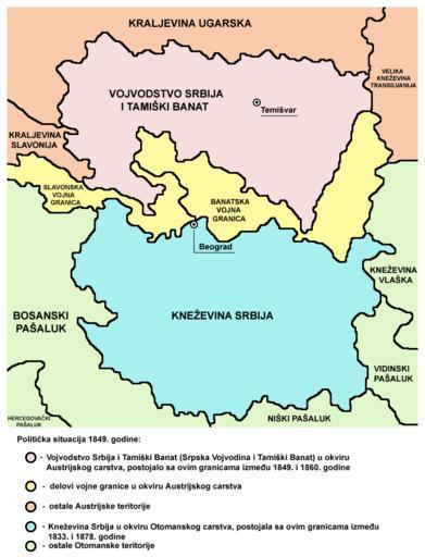Keywords: Serbia1849 sr latin.png en Two autonomous historical territories named Serbia 1 Principality of Serbia within Ottoman Empire 1833-1878 and 2 Voivodeship of Serbia and Banat of Temeschwar within Austrian Empire 1849-1860 - Serbian language Latin script map version <br>Serbian Dve autonomne istorijske teritorije sa nazivom Srbija 1 Kneževina Srbija u okviru Otomanskog carstva 1833-1878 i 2 Vojvodstvo Srbija i Tamiški Banat u okviru Austrijskog carstva 1849-1860 - latinična verzija mape na srpskom jeziku own PANONIAN Self-made map by PANONIAN References Published references The Times History of Europe Times Books 2002 Sima M Ćirković Srbi među evropskim narodima Beograd 2004 Dr Tomislav Bogavac Nestajanje Srba Niš 1994 Dragomir Jankov Vojvodina - propadanje jednog regiona Novi Sad 2004 Istorijski atlas Zavod za udžbenike i nastavna sredstva - Zavod za kartografiju Geokarta Beograd 1999 Školski istorijski atlas Zavod za izdavanje udžbenika Socijalističke Republike Srbije Beograd 1970 Peter Rokai - Zoltan Đere - Tibor Pal - Aleksandar Kasaš Istorija Mađara Beograd 2002 Lazo M Kostić Srpska Vojvodina i njene manjine Novi Sad 1999 Drago Njegovan Prisajedinjenje Vojvodine Srbiji Novi Sad 2004 Čedomir Popov - Jelena Popov Autonomija Vojvodine - srpsko pitanje Sremski Karlovci 2000 Dr Dušan J Popović Srbi u Vojvodini knjiga 3 Novi Sad 1990 J H Šviker Politička istorija Srba u Ugarskoj Novi Sad - Beograd 1998 Sigfrid Kaper Srpski pokret u južnoj Ugarskoj 1848-1849 Beograd - Valjevo 1996 Dimitrije Boarov Politička istorija Vojvodine Novi Sad 2001 Dejan Mikavica Srpska Vojvodina u Habsburškoj monarhiji 1690-1920 Novi Sad 2005 Dr Milenko Palić Srbi u Mađarskoj - Ugarskoj do 1918 Novi Sad 1995 Drago Njegovan Srpska Vojvodina Enciklopedija Novog Sada knjiga 26 Novi Sad 2005 Istorija Vojvodine Enciklopedija Novog Sada sveska 5 Novi Sad 1996 Vladimir Ćorović Ilustrovana istorija Srba knjiga peta Beograd 2006 Vasilije Krestić Iz prošlosti Srema Bačke i Banata Beograd 2003 Slavko Gavrilović Srbi u Habsburškoj Monarhiji 1792-1849 Novi Sad 1994 Milan Tutorov Banatska rapsodija Novi Sad 2001 Jovan M Pejin Iz prošlosti Kikinde Kikinda 2000 Rodoljub Malenčić Miletić Novi Sad 1996 Čedomir Popov - Slavko Gavrilović Evropska revolucija i srpski pokret 1848-1849 Beograd - Novi Sad 1997 Internet references http //www sluzba vojvodina sr gov yu/SEKRETARIJATI-V/MANJINE/manjine-koliko-se-poznajemo/web-tekst/Brosura-ceo-tekst htm Bahovo_doba_-_Vojvodstvo_Srbija_i_Tamiški_Banat Bahovo doba - Vojvodstvo Srbija i Tamiški Banat in Serbian http //www thomasgraz net/glass/fj1titel htm Titles of Habsburg emperors http //www terra es/personal7/jqvaraderey/185915BK GIF Map http //terkepek adatbank transindex ro/kepek/netre/57 gif Map http //terkepek adatbank transindex ro/kepek/netre/256 gif Map http //www historyonmaps com/BWSamples/Magyarorszagadminsitrative html Map http //www lib utexas edu/maps/historical/balkans_1859 jpg Map Voivodeship of Serbia and Banat of Temeschwar Maps of the Principality of Serbia Habsburg Military Frontier Maps of the Ottoman period in the history of Serbia Maps of the Habsburg period in the history of Serbia Maps of the history of Serbia in modern times Maps of the history of Vojvodina Maps of the Austrian Empire Maps of vassal states of the Ottoman Empire Maps in Serbian |