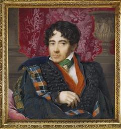 | Keywords: Serg.Serg.Saltykove by P.Rossi.jpg Се гей Васильевич Салтыков 1777 1846 PIETRO DE ROSSI RUSSIAN 1761-1831 Prince Sergey Saltykov in blue and russet wool tartan cloak with elaborate gold and royal blue tassel closure lined with another red green and blue tartan black dolman with elaborate frogging and tassels russet waistcoat white linen shirt with stand-collar green silk cravat with patterned bow and matching shirt studs short forward swept dark hair his left arm leaning on a cerise velvet pillow; damask curtain and classicising background signed and dated 'P de Rossi f 1829' lower right on ivory rectangular 4 1/8 x 4 1/16 in 106 x 103 mm ormolu frame with concentric waterleaf and tongue and scroll and trefoil borders elaborate foliate motifs and medallions adorning the spandrels ornately scrolled and festooned frame wings Provenance The sitter's daughter Anastasia Sergeyevna Saltykova 1810-1853 Imperial Russian lady-in-waiting and wife of Royal Norwegian Embassy Counsellor Christian Fredrik Jacob von Munthe af Morgenstierne 1806-1886 Their only daughter Alexandra Cathrine Henriette von Munthe af Morgenstierne 1838-1881 wife of Christian Carl Otto Lasson 1830-1893 Their fifth child Marie Lasson b 1864 Thence by family descent http //www mailchristies com/LotFinder/lot_details aspx intObjectID 5160920 century 19 Creator Pietro de Rossi House of Saltykov Pietro de Rossi Files uploaded by Shakko from various sources Munthe af Morgenstierne PD-old-100 |