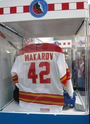 Keywords: Sergei Makarov jersey.JPG en The jersey worn by Sergei Makarov on his first NHL game with the Calgary Flames own Orlandkurtenbach 2010-02-14 Sergei Makarov ice hockey Ice hockey jerseys Number 42 on sportswear