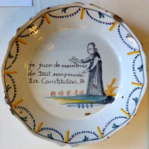 | Keywords: Serment clergé assiette.jpg en The plate shows a priest who holds a book which used to be the bible but now it's a symbol for the constitution The theme is the oath of the clergy on the constitution This oath became obligatory in Novembre 1790 The inscription cites part of the oath je jure de maintenir de tout mon pouvoir la constitution 'I swear to maintain the constitution with all my power' own Stanzilla ~ 1791 Plates of the French Revolution Faience of Nevers on the French Revolution Files by User Stanzilla 1791 works in France Priests in art Faience in the Musée des Beaux-Arts de Bernay Cc-zero |
