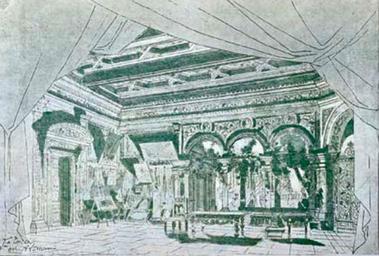 | Keywords: Set by Lemeunier for Act 3 La Tosca 1887.jpg en Stage set by Lemeunier for Act 3 of Sardou's play La Tosca Cavaradossi's villa http //www puccini it/scientifica/MostraTosca pdf plate 6 p 22 Lemeunier 1887 PD-Art Ink drawings Set designs Victorien Sardou |