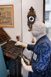 Keywords: setzer paper mache papier-mâché man models fig shirt blue letter pattern humorous person action activity shuttle wash lead characters glasses clock old image art