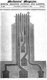 | Keywords: Seven-flue Stack 1834.png A seven-flue stack showing how it would be cleaned by Chimney sweep Climbing boys or with little modification by a human cleaning machine a brush In the diagram A- is a hearth served by vertical flue a horizontal flue and then a vertical rise having two right-angled bends that were difficult for brushes B- is a long straight flue 14in by 9in being climbed by a boy using back elbows and knees C- is a short flue from a second floor hearth The climbing boy has reached the chimney pot which has a diametre too small for him to exit that way D omitted is a short flue from the third floor E shows a disaster The climbing boy is stuck in the flue his knees jammed against his chin The master sweep will have to cut away the chimney to remove him First he will try to persuade him to move sticking pins in the feet lighting a small fire under him Another boy could climb up behind him and try to pull him out with a rope tied round the legs- it would be hours before he suffocated F omitted G How a flue could be straighten to make it sweepable by mechanical means H A dead climbing boy suffocated in a fall of soot that accumulated at the cant of the flue Strange 1982 7 Mechanics' Magazine digitised 4 Oct 1834/ Uploaded 9 May 2011 Clem Rutter Joseph Glass 1834 PD-old Images from The Mechanics Magazine Chimneys Chimney sweeps Drawings of chimneys |
