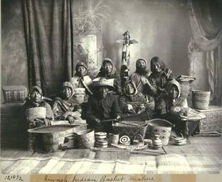 | Keywords: Seven Indian women and two men with baskets and woodcarvings, probably Tlingit, Alaska, ca 1893 (LAROCHE 79).jpeg check categories 8 June 2016 2 Photograph Creator Frank La Roche Nine Salishan basketmakers 7 women 2 men ca 1890-1895 The group is seated on a woven mat with a variety of baskets displayed in front and beside them Several also hold baskets including a half-finished one Some wood carvings possible Tlingit including a totem are also displayed The group all have blankets around their shoulders the women wear kerchiefs and the older man in front has a woven hat They are posed in front of a painted backdrop of an arbor Caption on image Siwash Indian basket makers Subjects LCTGM Baskets Subjects LCSH Portraits Group--Washington State ; Salishan Indians--Arts crafts; Wood carvings--Indians of North America--Northwest Coast of North America depicted place Alaska ca 1893 Institution University of Washington UWASH-LAROCHE-source accession number laroche 79 PD-old-auto-1923 1936 Information field Order Number LAR092 Images from the Frank La Roche Photographs Collection to check Baskets Alaska |