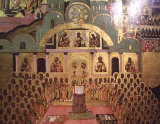 | Keywords: Seventh ecumenical council (Icon) detail 02.jpg Siebentes Ökumenisches Konzil Ikone 17 Jhd Nowodewitschi-Kloster Moskau Seventh ecumenical council Icon 17th century Novodevichy Convent Moscow СЕДЬ ОЙ ВСЕЛЕ СКИЙ СОБОР Симон Ушаков 1670-е годы осква О ужейная палата Де ево; темпе а 177 х 133 х 4 5 Поступила в 1930-е годы П оисходит из оводевичьего монасты я ГИ инв 103803 ИI-1292 own photo by shakko 1670-е годы Симон Ушаков PD-old-100 17th-century icons in Moscow State Historical Museum Second Council of Nicaea icons of Novodevichy Convent Hetoimasia Byzantine Iconoclasm Simon Ushakov Icons by Kremlin workshops Exhibition Sainte Russie Moscow 2011 - icons |