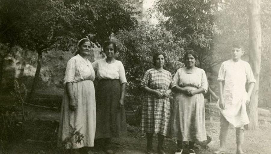 | Keywords: nellie miller mann nelliemillermann near east relief neareastrelief orphans refugees servants garden monochrome outdoor Caption: Several of our servants taken in our garden. The small tree to the left is an orange tree. Ripe oranges are now hanging on it. 1. Miriam the cook - a splendid woman and an expert cook 2. Afeefie - wait tables and help the cook, keep dining room in order 3. Najila - wait tables and help the cook, keep dining room in order 4. One of the wash women 5. The kitchen boy - notice his clap-clops, made of a piece of wood with a strap over the toes. It is very funny to see children run with clap-clops on. They slip these off when entering a clean room - barefooted. Citation: Cleo A. and Nellie Miller Mann Papers, 1920-2000. Nellie Miller Mann Photographs, 1922-1924. HM1-695, Box 4. Mennonite Church USA Archives - Goshen. Goshen, Indiana. Caption: Several of our servants taken in our garden. The small tree to the left is an orange tree. Ripe oranges are now hanging on it. 1. Miriam the cook - a splendid woman and an expert cook 2. Afeefie - wait tables and help the cook, keep dining room in order 3. Najila - wait tables and help the cook, keep dining room in order 4. One of the wash women 5. The kitchen boy - notice his clap-clops, made of a piece of wood with a strap over the toes. It is very funny to see children run with clap-clops on. They slip these off when entering a clean room - barefooted. Citation: Cleo A. and Nellie Miller Mann Papers, 1920-2000. Nellie Miller Mann Photographs, 1922-1924. HM1-695, Box 4. Mennonite Church USA Archives - Goshen. Goshen, Indiana. |